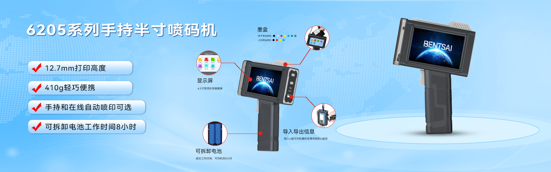 • 适用多种打印 适合打印生产日期、有效期、批号、序列号、计数器、二维码、条形码、图形、图像、标志等 • 区分手持式和在线式 实现在生产线上的自动打印,从而提高生产效率。 • 超长待机时间 长达16小时的超长待机时间,内置可拆卸电池,用户可自行更换 • 简洁界面,方便快捷 双模式(简洁模式,高级模式)优化用户界面 • 重量轻,体积小 紧凑的设计,整机净重420g,轻巧易携带