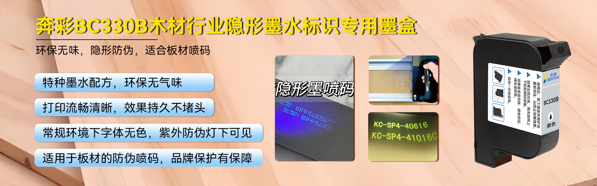 ·特种墨水配方,环保无气味 ·打印流畅清晰,效果持久不堵头 ·常规环境下字体无色,紫外防伪灯下可见 ·适用于板材的防伪喷码,品牌保护有保障 创新型工业级板材隐形防伪喷码全新解决方案。木材行业专用墨盒更低的打印成本,更少的喷嘴堵塞,更低的维护频次,更稳定的生产保障