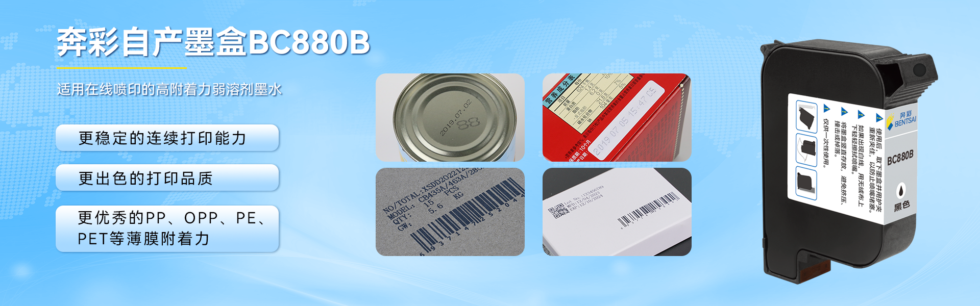·更稳定的连续打印能力 ·更出色打印品质 ·更优秀的PP、OPP、PE、PET等薄膜附着力 BC880B 创新型工业级TIJ墨盒在线打印全新解决方案。更优秀的基材附着力,更出色的打印品质,更少的喷嘴堵塞,更低的维护频次,更稳定的生产保障。助您能在竞争激烈的工业在线打印市场上占有一席之地。